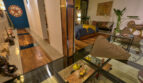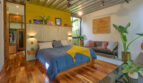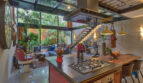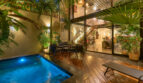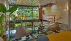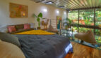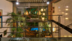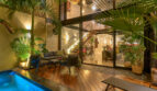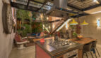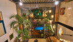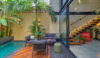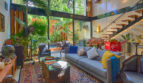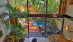 Enter from a generous foyer which transitions into a large open living/kitchen/dining area with a two story high tin ceiling. Off the foyer is a door to the garage, a laundry/equipment room, a full bathroom, and a wonderful plant-filled two story light well which brings daylight and airflow throughout the house. The entire back of the house is constructed of huge glass doors and windows which let in more light and air and melds the patio with the indoor living spaces. This is indoor/outdoor living at its best. Indoor plants, outdoor plants, all are part of the overall design which takes advantage of every square meter of space.